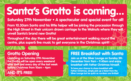 The Walnuts Shopping Centre will be holding a Christmas launch on Saturday 27th November and Sunday 28th November, for shoppers to get into the christmasy spirit. Santas Groto will also be at the centre for children to come and give their christmas lists. He will be there every weekend up till the week of christmas and every day for the last week before christmas, from 10:00am - 4:00pm.